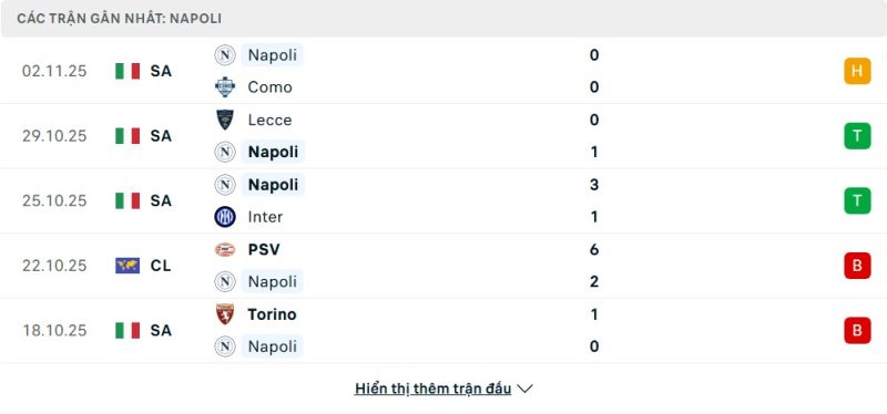 5 trận gần nhất của Napoli: D-W-W-L-L