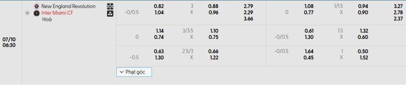 Bảng Tỷ lệ kèo bóng đá New England Revolution vs Inter Miami CF