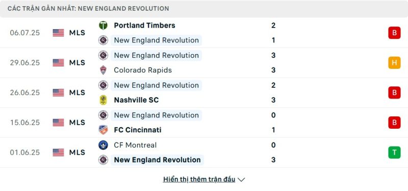 5 trận gần nhất của New England Revolution: L-D-L-L-W