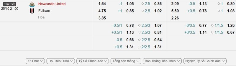 Bảng Tỷ lệ kèo bóng đá Newcastle United vs Fulham