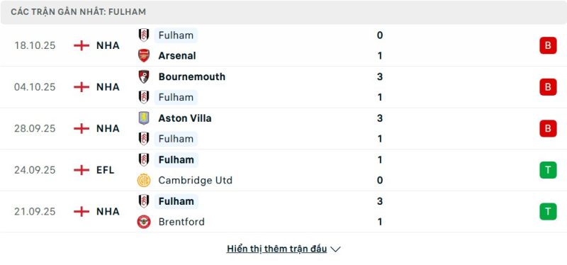 5 trận gần nhất của Fulham: L-L-L-W-W