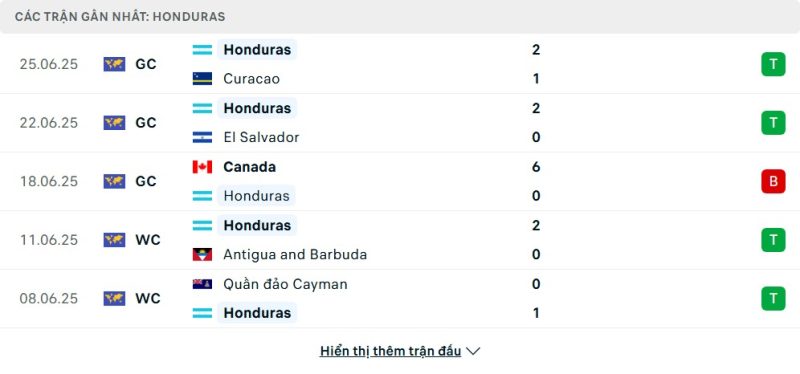 5 trận gần nhất của Honduras: W-W-L-W-W