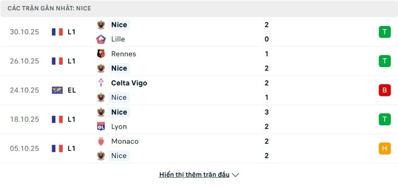 Bên kia chiến tuyến, Nice cũng đang có giai đoạn thăng hoa tại Ligue 1. Họ đang xếp thứ 8 với 17 điểm, chỉ kém top 4 đúng 2 điểm. Điều đáng chú ý là phong độ 5 vòng gần nhất của “Đại bàng” rất tốt khi họ bất bại, giành được 3 chiến thắng và 2 trận hòa. Chuỗi trận ấn tượng này bao gồm các kết quả tốt trước Lyon, Rennes và Lille. Tuy nhiên, thành tích của Nice tại Europa League lại đáng báo động khi họ toàn thua cả 3 trận gần nhất. Sự tập trung vào giải quốc nội có thể giúp họ gây bất ngờ.