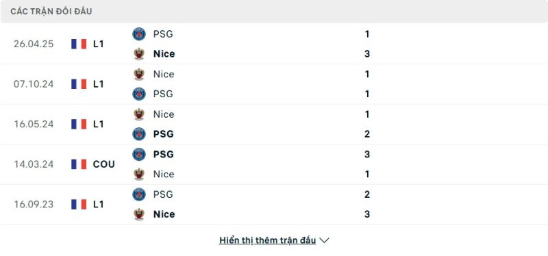 Thành tích đối đầu của Paris Saint-Germain vs Nice