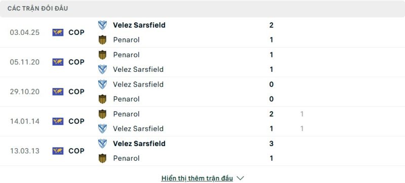 Thành tích đối đầu của Peñarol vs Vélez Sarsfield