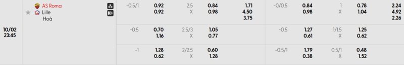 Bảng Tỷ lệ kèo bóng đá Roma vs Lille