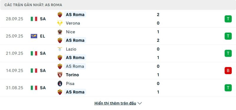Roma đang thể hiện sự ổn định đáng kể trong giai đoạn mở màn mùa giải 2025/26. Ở Serie A, họ lần lượt đánh bại Bologna, Pisa và mới nhất là Verona, qua đó duy trì vị thế trong nhóm cạnh tranh tốp đầu. Đặc biệt, chiến thắng quan trọng ngay trên sân Lazio cho thấy bản lĩnh thi đấu sân khách vững vàng. Ở đấu trường Europa League, Roma cũng khởi đầu thuận lợi bằng việc vượt qua Nice, nhờ sự chắc chắn trong khâu phòng ngự và hiệu quả ở tuyến trên. Hiện tại, Roma đang đứng ở nhóm đầu bảng xếp hạng Europa League với 3 điểm trọn vẹn.