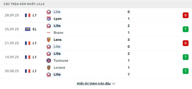5 trận gần nhất của Lille: L-W-L-W-W