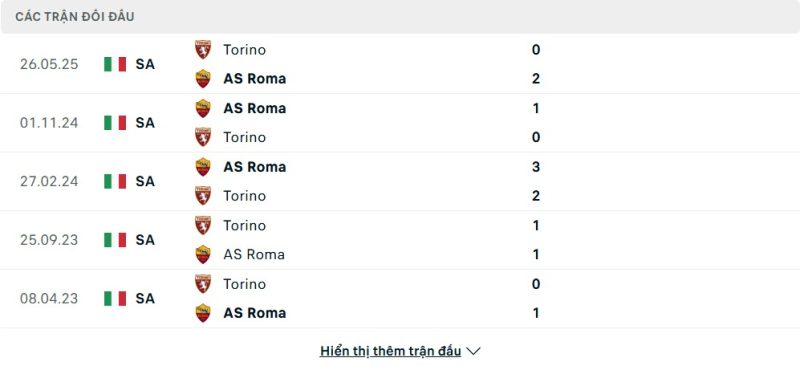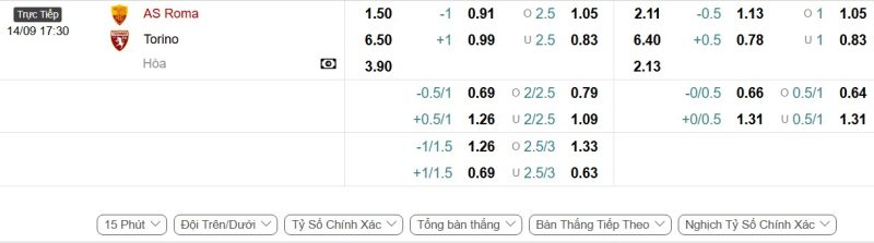 Bảng Tỷ lệ kèo bóng đá Roma vs Torino