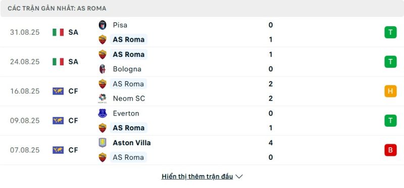 Roma đang có khởi đầu rất ấn tượng tại Serie A mùa này khi giành trọn 6 điểm sau 2 vòng đấu, tạm thời đứng trong nhóm dẫn đầu bảng xếp hạng. Ở trận mở màn, Roma đánh bại Bologna với lối chơi chặt chẽ và hiệu quả, sau đó tiếp tục giành chiến thắng trước Pisa ngay trên sân khách. Đáng chú ý, trước đó đội bóng áo bã trầu cũng có loạt trận giao hữu thành công, thắng những đối thủ khó chịu như Everton và Lens. Với phong độ ổn định, hàng phòng ngự chắc chắn cùng hàng công ghi bàn đều đặn, Roma đang chứng minh họ sẵn sàng cạnh tranh cho mục tiêu cao.