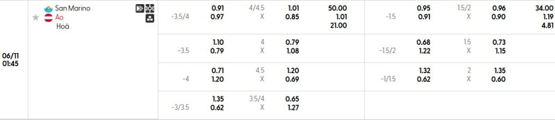 Bảng Tỷ lệ kèo bóng đá San Marino vs Áo