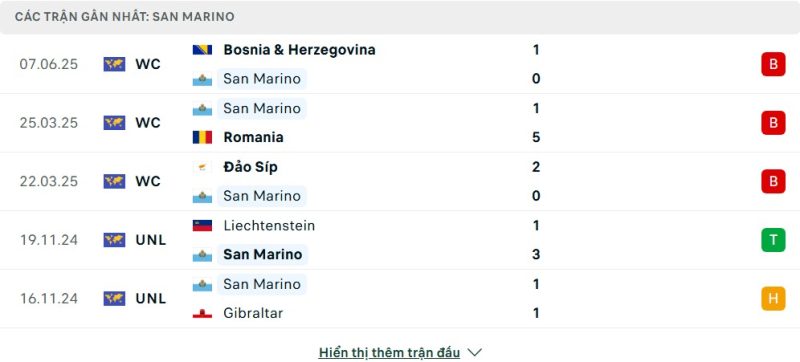 5 trận gần nhất của San Marino: L-L-L-W-D