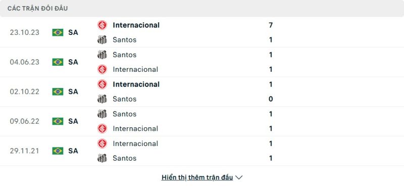 Thành tích đối đầu của Santos vs Internacional