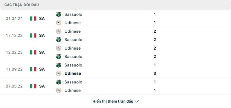 Bảng Tỷ lệ kèo bóng đá Sassuolo vs Udinese
