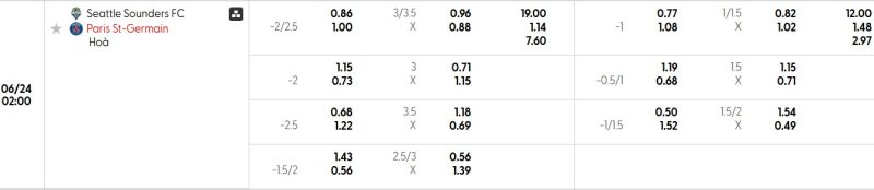 Bảng Tỷ lệ kèo bóng đá Seattle Sounders FC vs Paris Saint-Germain