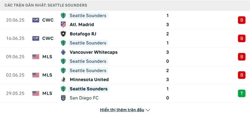 Thống kê phong độ gần đây Seattle Sounders FC vs Paris Saint-Germain