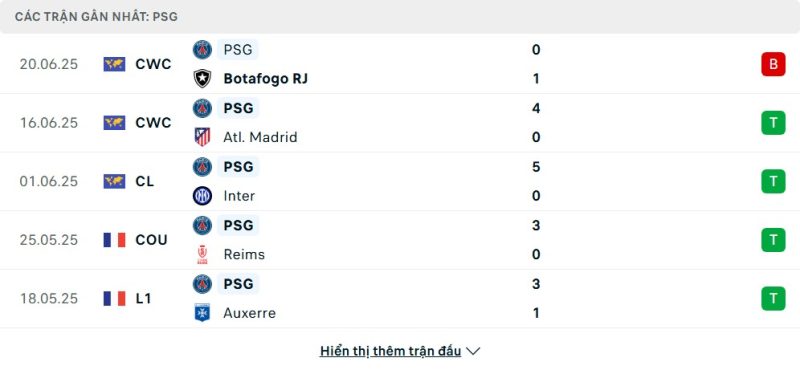 5 trận gần nhất của Paris Saint-Germain: L-W-W-W-W