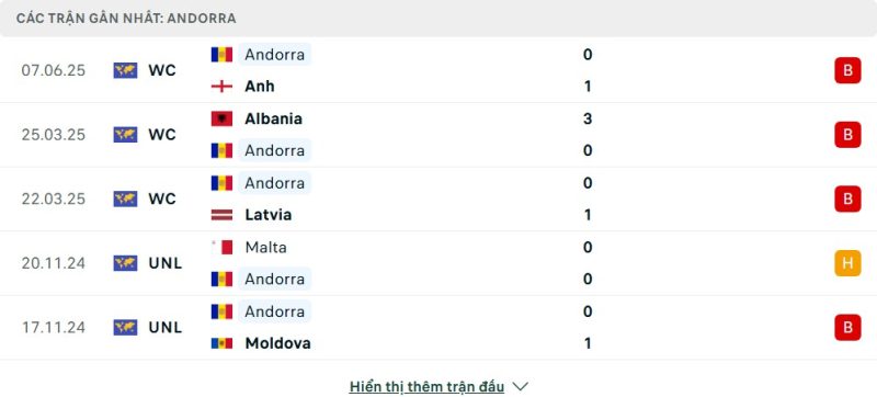 5 trận gần nhất của Andorra: L-L-L-D-L