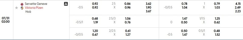 Bảng Tỷ lệ kèo bóng đá Servette FC vs Viktoria Plzeň
