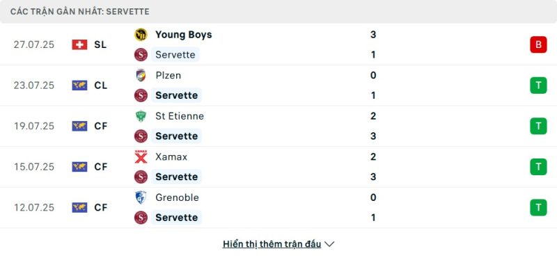 5 trận gần nhất của Servette FC: L-W-W-W-W