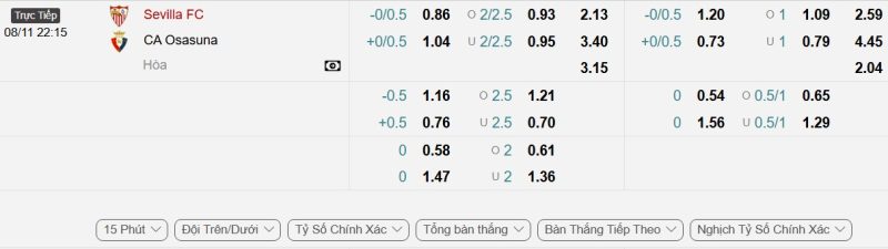 Bảng Tỷ lệ kèo bóng đá Sevilla vs Osasuna