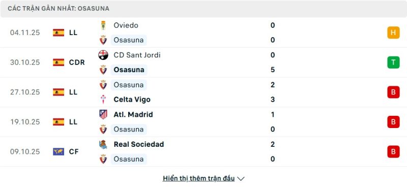 5 trận gần nhất của Osasuna: D-W-L-L-L
