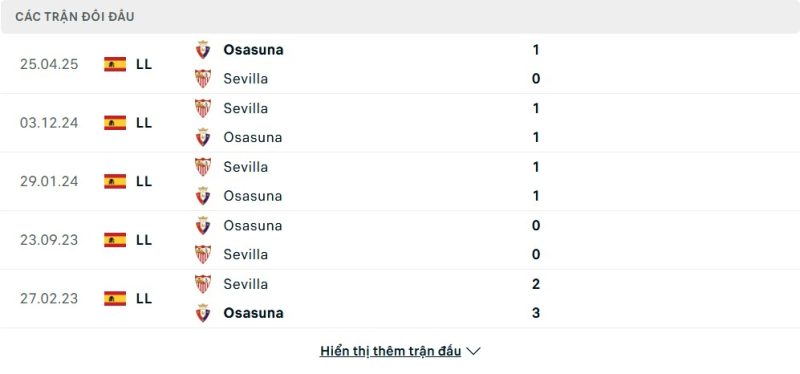 Thành tích đối đầu của Sevilla vs Osasuna