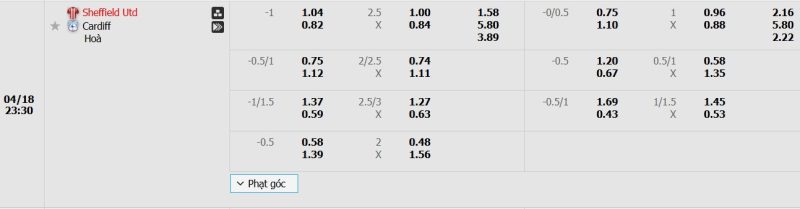 Bảng Tỷ lệ kèo bóng đá Sheffield United vs Cardiff City