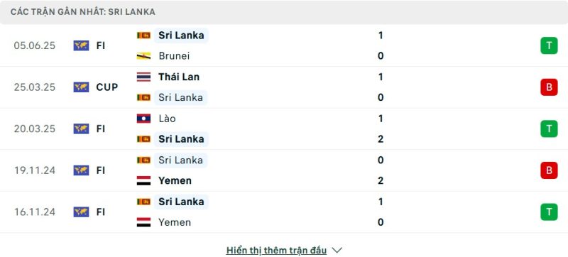 Thống kê phong độ gần đây Sri Lanka vs Đài Loan