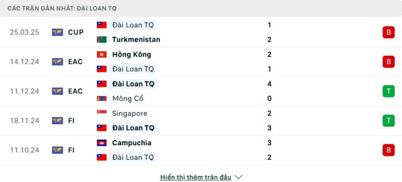 5 trận gần nhất của Đài Loan: L-L-W-W-L