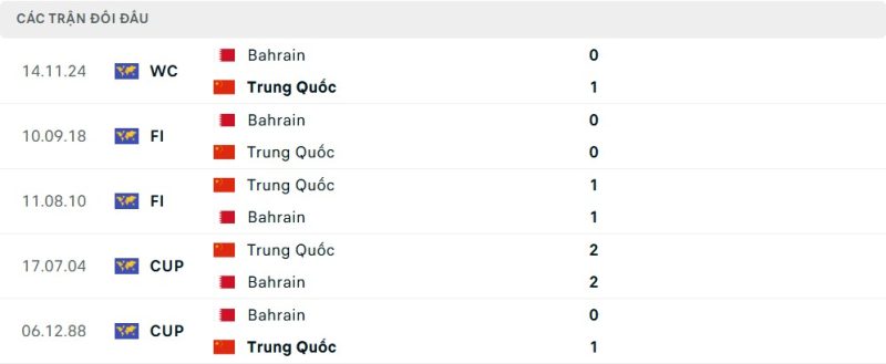 Thành tích đối đầu của Trung Quốc vs Bahrain