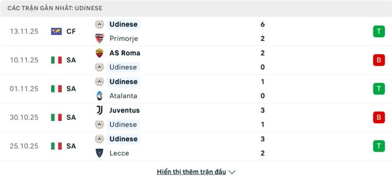 5 trận gần nhất của Udinese: W-L-W-L-W