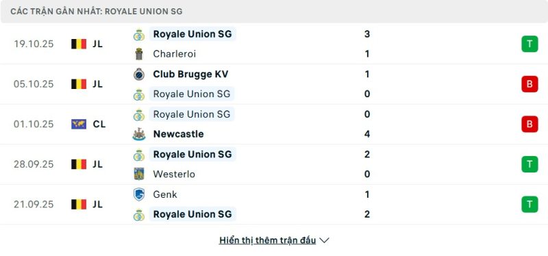 5 trận gần nhất của Union Saint-Gilloise: W-L-L-W-W