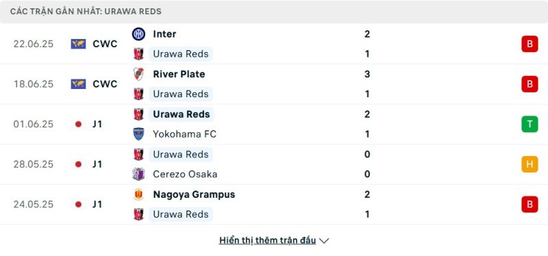 5 trận gần nhất của Urawa Red Diamonds: L-L-W-D-L