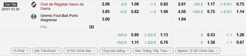 Bảng Tỷ lệ kèo bóng đá Vasco da Gama vs Grêmio