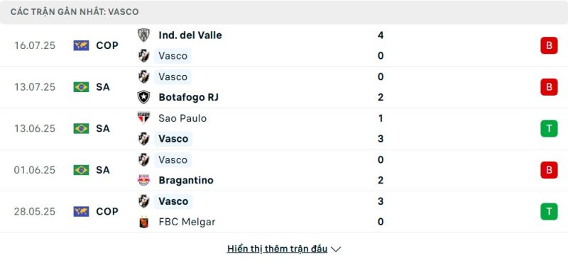 Vasco da Gama tiếp tục khiến người hâm mộ lo lắng với chuỗi phong độ thiếu ổn định. Nhìn vào 4 trận gần nhất trên mọi đấu trường, họ chỉ có 1 chiến thắng, còn lại là những thất bại đầy thất vọng, bao gồm trận thua 0-4 trước Independiente del Valle mới đây. Tại giải VĐQG, Vasco cũng không tận dụng tốt lợi thế sân nhà, khi vừa trắng tay trong cuộc đối đầu với Botafogo RJ. Vị trí thứ 15 trên bảng xếp hạng là minh chứng rõ ràng cho sự chật vật trong giai đoạn đầu mùa của đội bóng này.