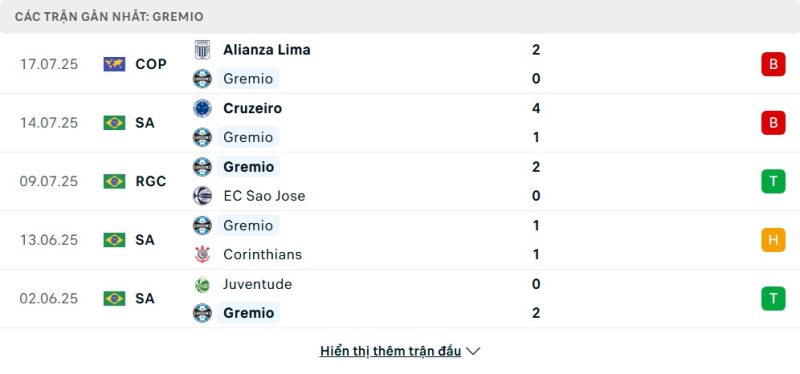 5 trận gần nhất của Grêmio: L-L-W-D-W