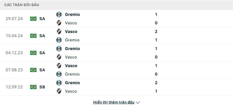 Thành tích đối đầu của Vasco da Gama vs Grêmio
