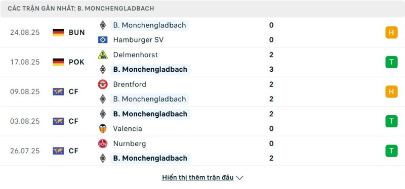 5 trận gần nhất của Borussia Mönchengladbach: D-W-D-W-W